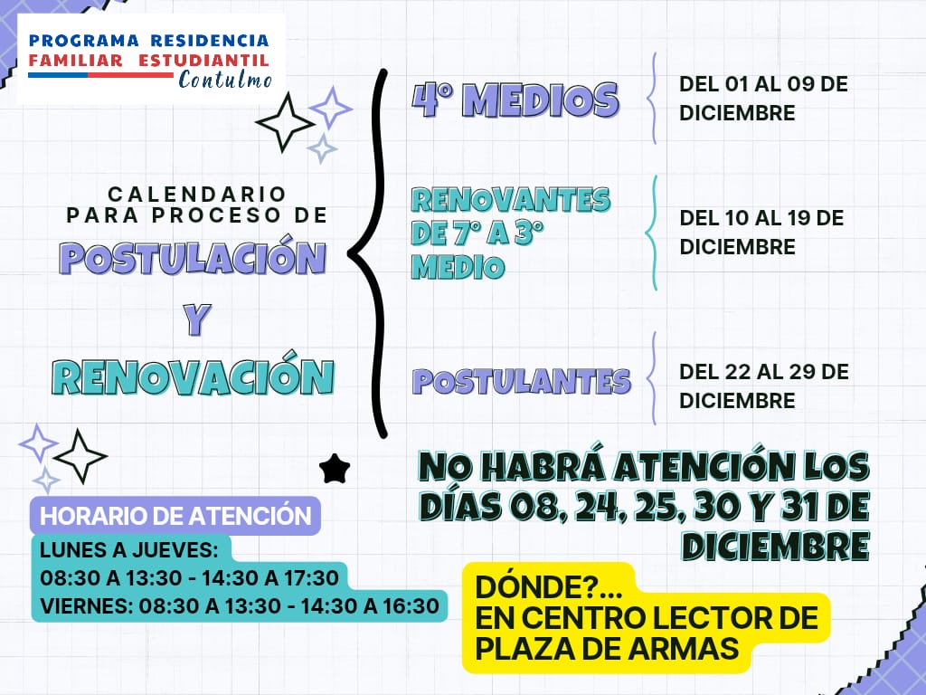 El Alcalde Carlos Leal Neira, junto al Departamento de Educación (DAEM) y Jacqueline García Vera, Coordinadora del Programa Residencia Familiar Estudiantil, les extienden una cordial invitación.