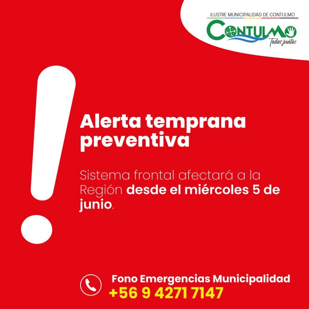 La Unidad de Gestión de Riesgos y Desastres de nuestra Municipalidad informa sobra la vigencia de la 𝐀𝐥𝐞𝐫𝐭𝐚 𝐓𝐞𝐦𝐩𝐫𝐚𝐧𝐚 𝐏𝐫𝐞𝐯𝐞𝐧𝐭𝐢𝐯𝐚 de carácter regional por sistema frontal que afectará a la Región del Biobío con proyección hacia nuestra comuna a contar de miércoles 5 de junio.