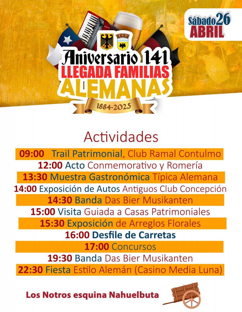 Te invitamos a ser parte de las distintas actividades que se desarrollaran en el marco de la conmemoración de los 141 años de la llegada de las primeras familias alemanas a Contulmo.