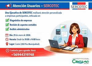 Informamos a la comunidad empresarial de nuestra comuna que este jueves 29 de enero, una ejecutiva de SERCOTEC estará realizando…