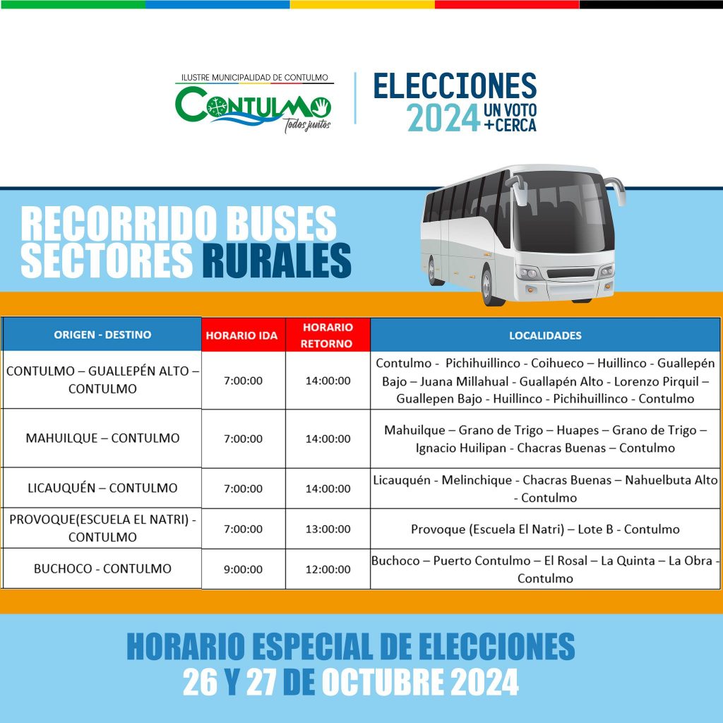 RECORRIDO DE BUSES SECTORES RURALES SERVICIO SUBSIDIADO Se informa a la comunidad los horarios de los recorridos de buses para los sectores rurales este el 26 y 27 de octubre.